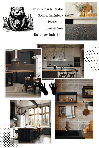 Le castor, symbole de solidité, d’ingéniosité et de protection, inspire un design à la fois rustique et industriel. Pour cette inspiration, nous avons opté pour une combinaison de bois et de noir, créant un contraste saisissant qui reflète la robustesse et l'efficacité de cet animal dans son habitat.