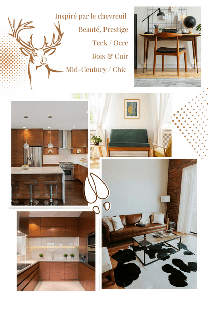 L'alliance du bois et du cuir, associée à des touches d'ocre, évoque la beauté sauvage et la noblesse de cet animal tout en apportant une touche de chaleur et de sophistication à l’intérieur. Ce style chic et mid-century, tout en étant moderne, reflète la rapidité et l’agilité du chevreuil dans un cadre à la fois dynamique et serein.