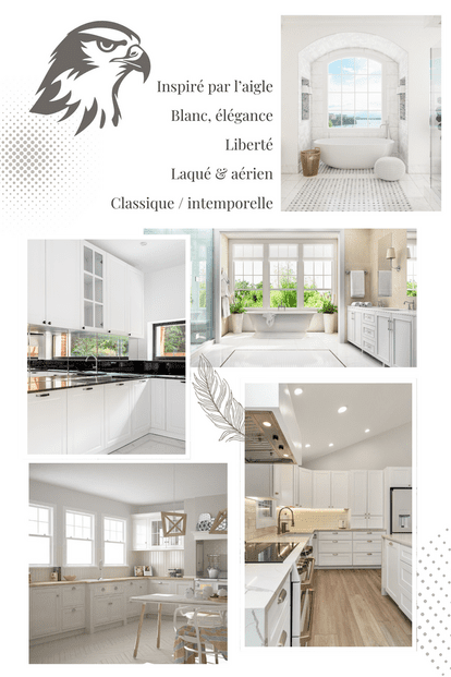 Le blanc, associé à la laque et aux textures aériennes, capture l’essence de cet oiseau majestueux. L’aigle est reconnu pour sa capacité à survoler les cieux avec agilité et précision, et cet esprit de liberté se retrouve dans nos choix de matériaux et d'agencements. Le style choisi est à la fois classique et intemporel, avec une sophistication qui évoque la grandeur de ce rapace.