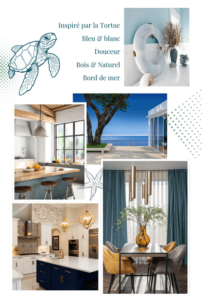 La tortue, symbole de longévité, de sagesse et de patience, inspire un design apaisant et naturel. Pour cette inspiration, nous avons choisi une palette de bleu et blanc, évoquant la tranquillité des mers, combinée à des matériaux naturels comme le bois, pour créer une atmosphère douce et sereine.