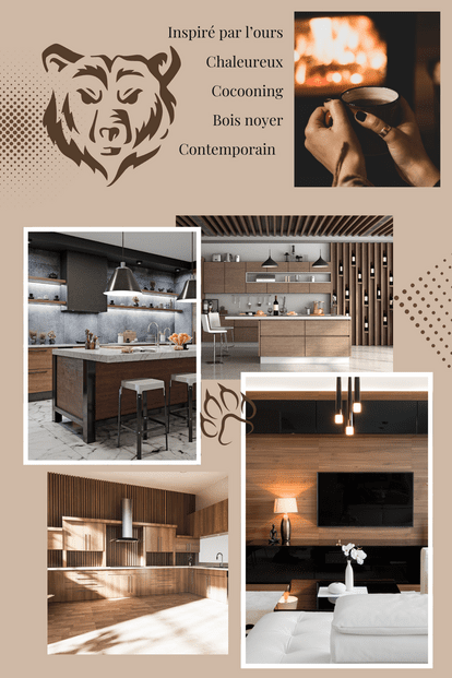 L'ours, symbole de force, de courage et de stabilité, inspire un design chaleureux et enveloppant. Pour cette inspiration, nous avons choisi d'intégrer des éléments de bois de noyer, réputé pour sa profondeur et son caractère, créant ainsi un environnement cocooning et contemporain.